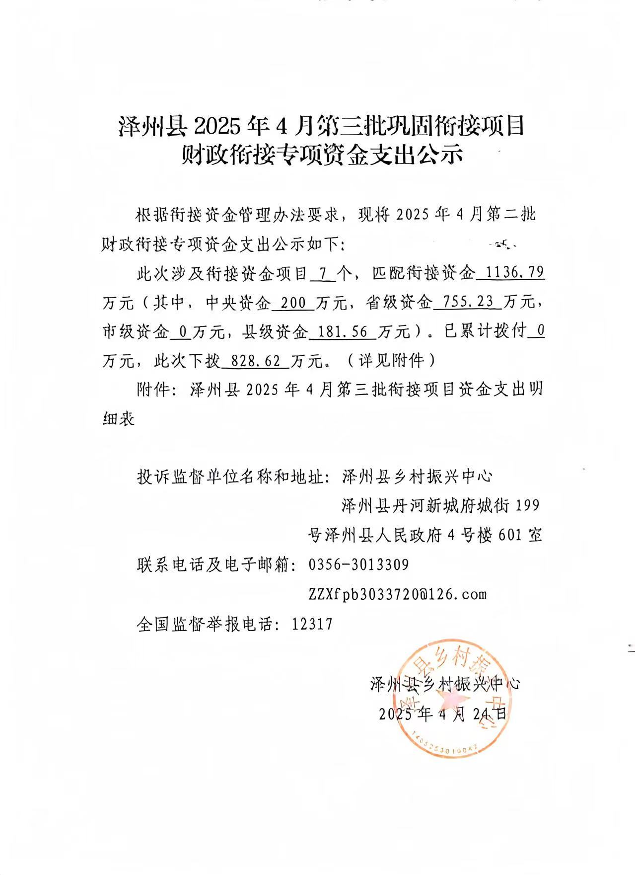 澤州縣2025年4月第三批鞏固銜接項目財政銜接專項資金支出公示