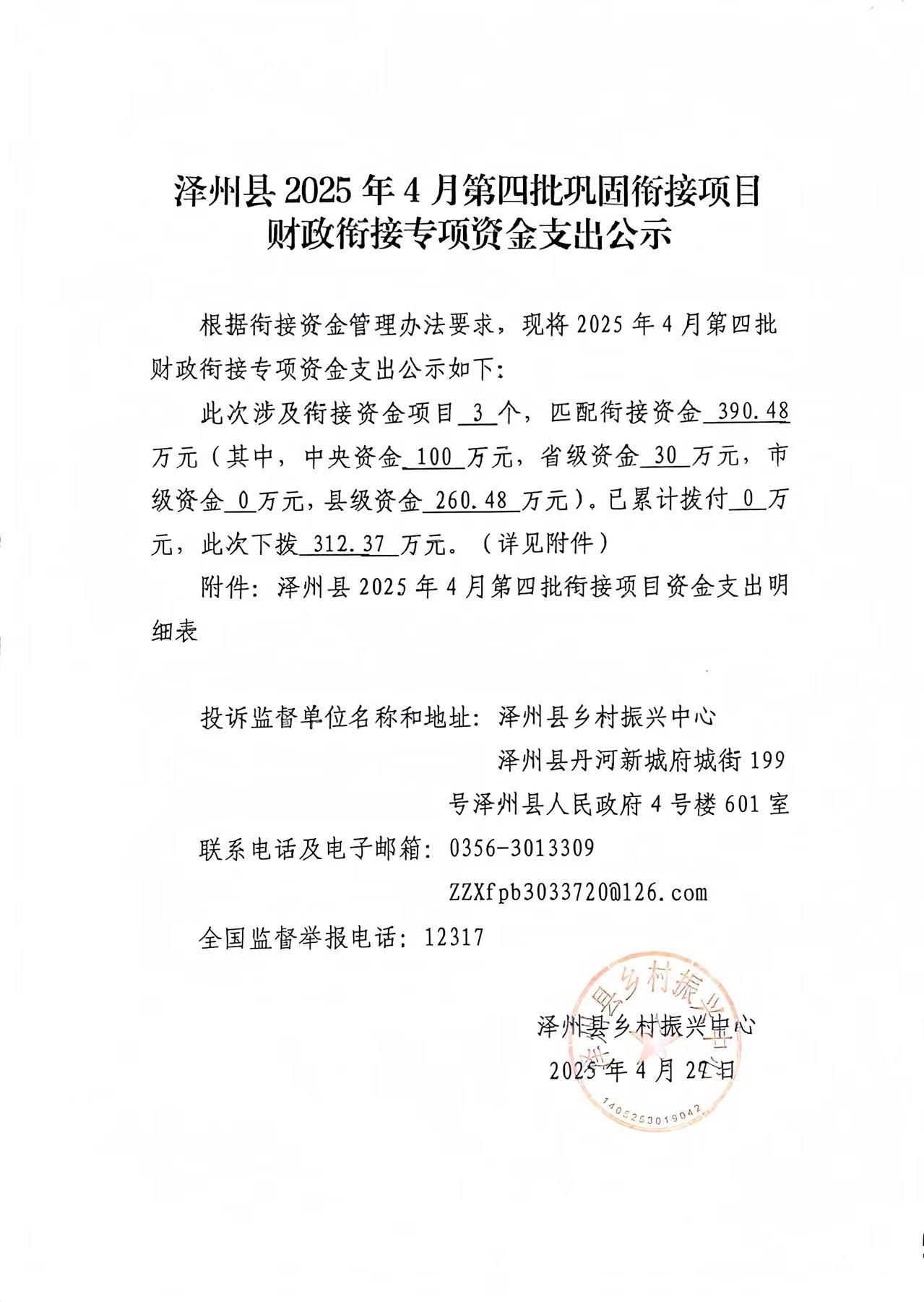 澤州縣2025年4月第四批鞏固銜接項目財政銜接專項資金支出公示