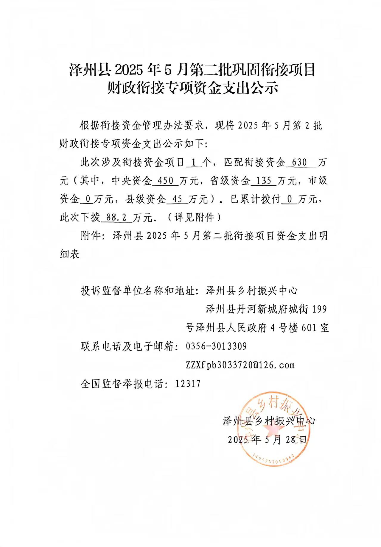 澤州縣2025年5月第二批鞏固銜接項目財政銜接專項資金支出公示
