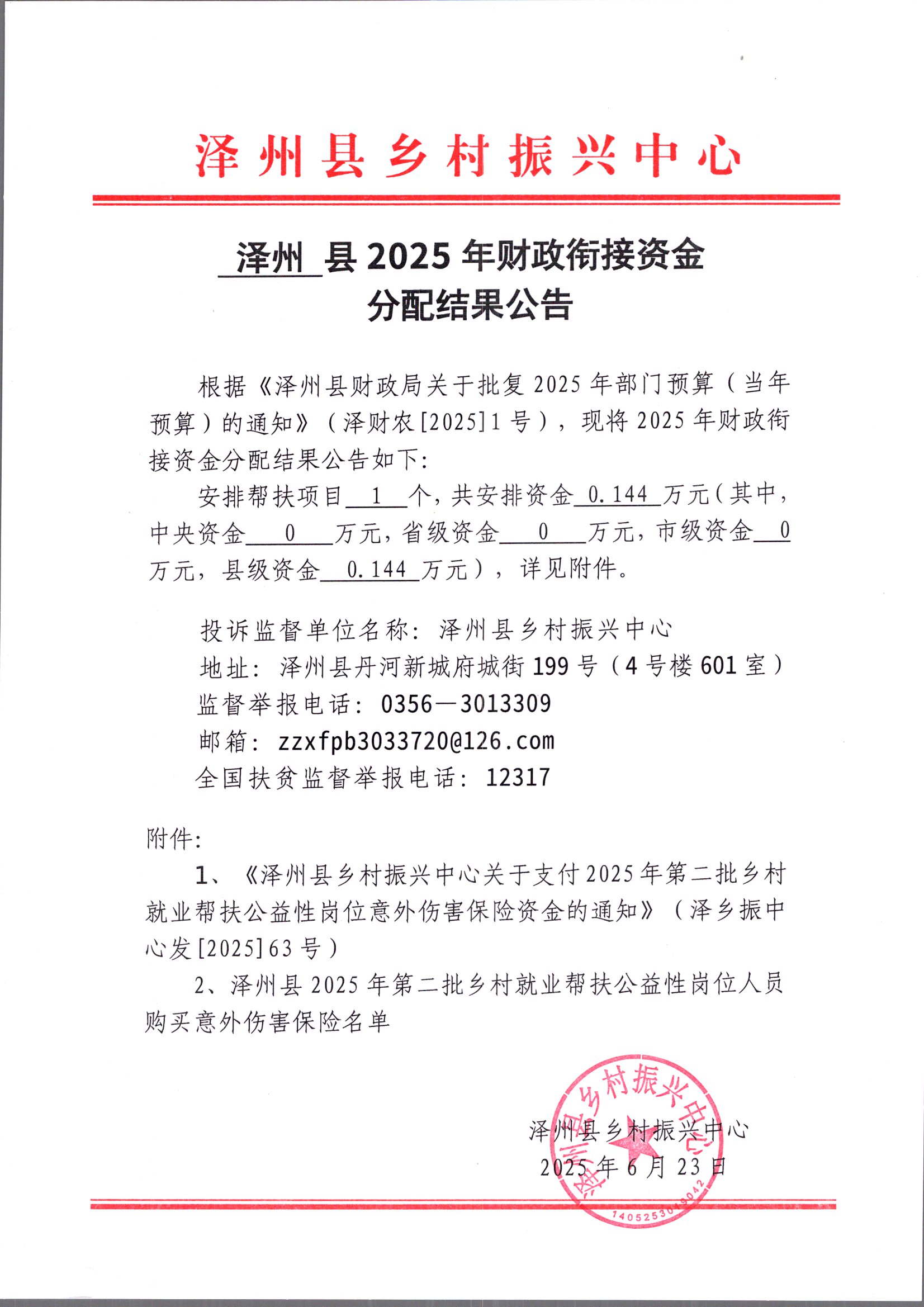 附件:附件1:澤州縣鄉村振興中心關于撥付2025年第二批鄉村就業幫扶公益性崗位意外傷害保險資金的通知(澤鄉振中心發[2025]63號).pdf
