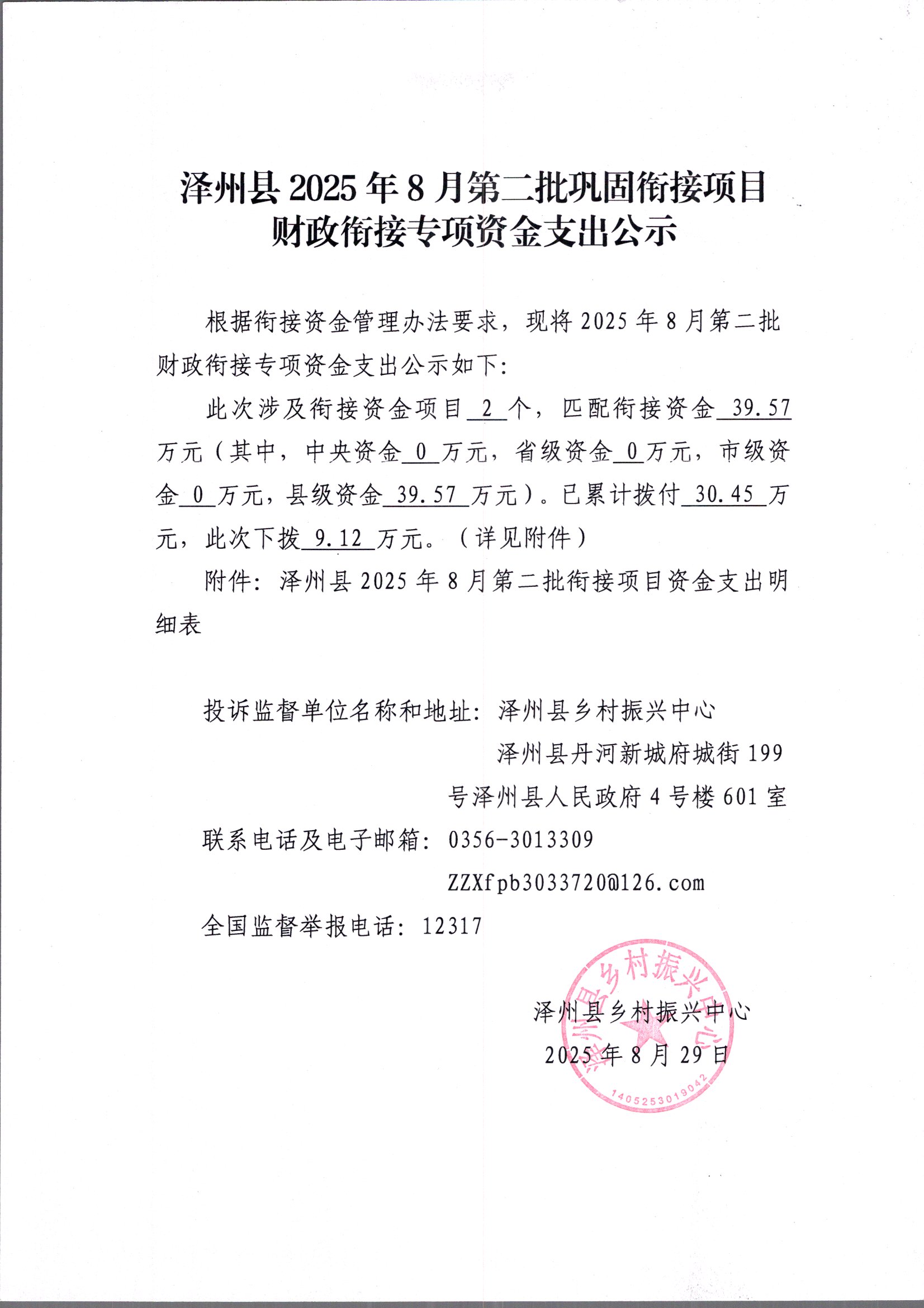 澤州縣2025年8月第二批鞏固銜接項目 財政銜接專項資金支出公示