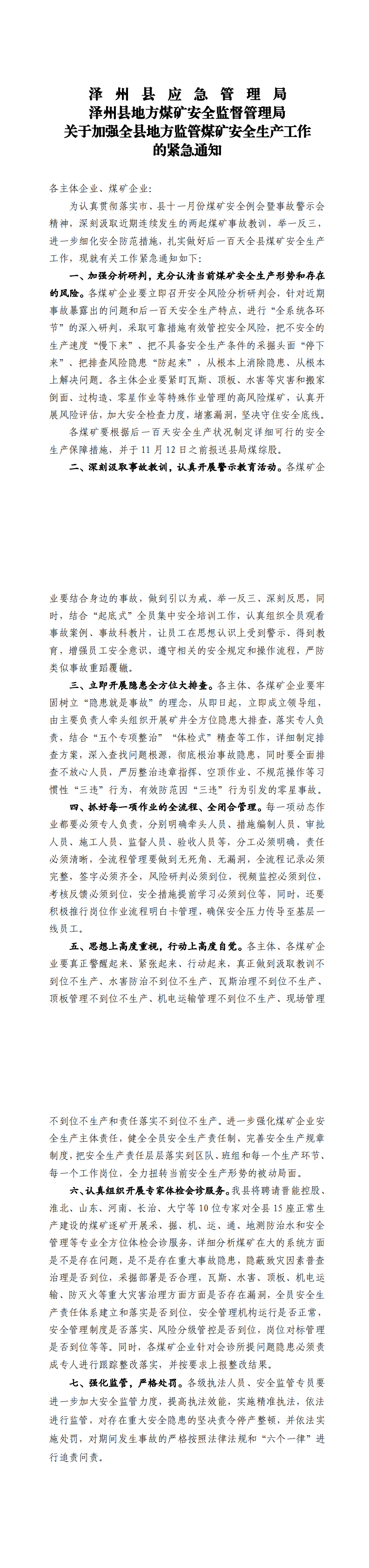 澤州縣應急管理局 澤州縣地方煤礦安全監督管理局 關于加強全縣地方監管煤礦安全生產工作的緊急通知