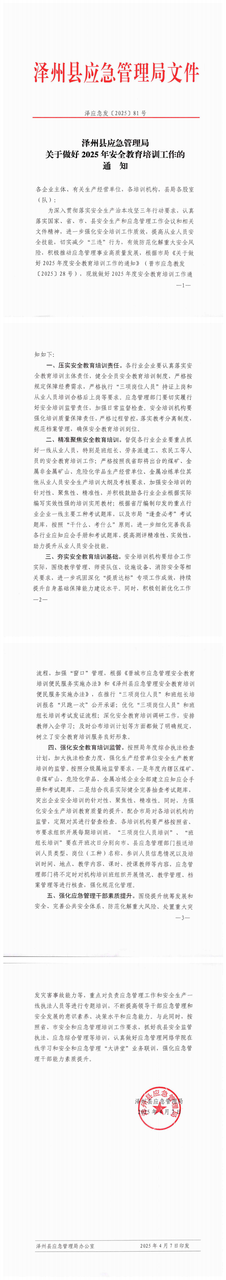澤州縣應急管理局 關于做好2025年安全教育培訓工作的通知