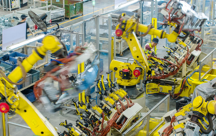 2025年10月9日,浙江省湖州市長興經濟技術開發區的長興地通汽車部件有限公司技術人員操控工業機器人生產新能源汽車配件(無人機照片)。新華社發(譚云俸攝)