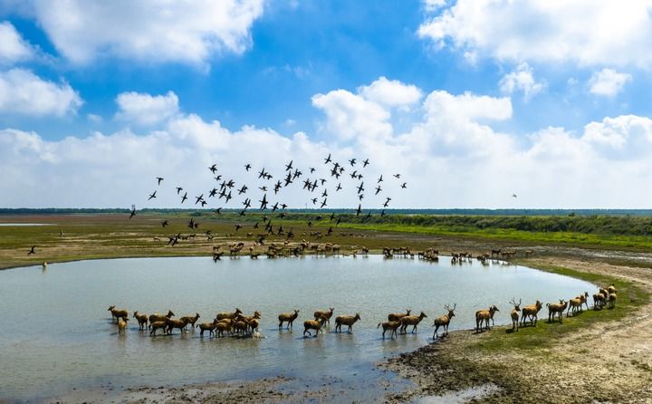 2025年10月11日,在江蘇東臺條子泥濕地,候鳥飛翔,成群野生麋鹿悠閑散步,一派人與自然和諧共生的生態美景(無人機照片)。新華社發(孫家錄攝)