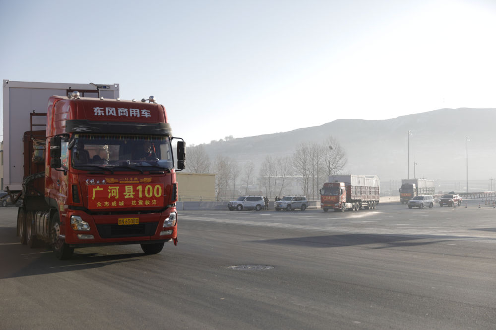 2023年12月26日,在甘肅省臨夏州積石山高速出口,載著活動板房的貨車駛向受災鄉鎮。新華社記者 方欣 攝