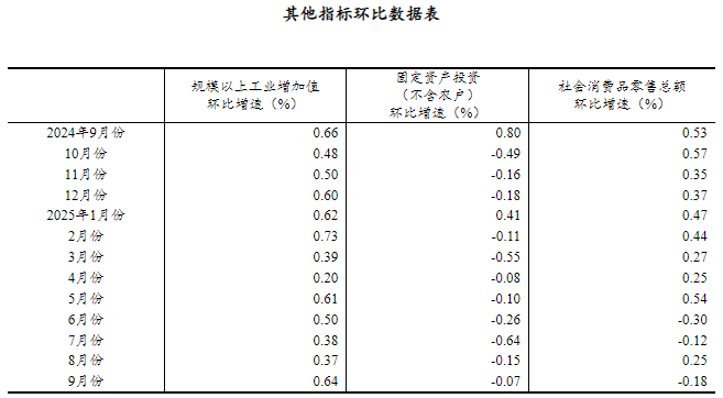 (2)根據(jù)季節(jié)調(diào)整模型自動(dòng)修正結(jié)果,對(duì)近一年來(lái)各期國(guó)內(nèi)生產(chǎn)總值、規(guī)模以上工業(yè)增加值、固定資產(chǎn)投資(不含農(nóng)戶)、社會(huì)消費(fèi)品零售總額環(huán)比增速進(jìn)行修訂。修訂結(jié)果及2025年三季度GDP環(huán)比數(shù)據(jù)、2025年9月份其他指標(biāo)環(huán)比數(shù)據(jù)如下: