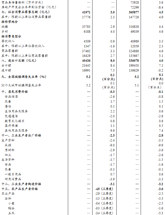 前三季度,全國(guó)固定資產(chǎn)投資(不含農(nóng)戶)371535億元,同比下降0.5%;扣除房地產(chǎn)開(kāi)發(fā)投資,全國(guó)固定資產(chǎn)投資增長(zhǎng)3.0%。分領(lǐng)域看,基礎(chǔ)設(shè)施投資同比增長(zhǎng)1.1%,制造業(yè)投資增長(zhǎng)4.0%,房地產(chǎn)開(kāi)發(fā)投資下降13.9%。全國(guó)新建商品房銷售面積65835萬(wàn)平方米,同比下降5.5%;新建商品房銷售額63040億元,下降7.9%。分產(chǎn)業(yè)看,第一產(chǎn)業(yè)投資同比增長(zhǎng)4.6%,第二產(chǎn)業(yè)投資增長(zhǎng)6.3%,第三產(chǎn)業(yè)投資下降4.3%。民間投資同比下降3.1%;扣除房地產(chǎn)開(kāi)發(fā)投資,民間投資增長(zhǎng)2.1%。高技術(shù)產(chǎn)業(yè)中,信息服務(wù)業(yè),航空、航天器及設(shè)備制造業(yè),計(jì)算機(jī)及辦公設(shè)備制造業(yè)投資同比分別增長(zhǎng)33.1%、20.6%、7.4%。9月份,固定資產(chǎn)投資(不含農(nóng)戶)環(huán)比下降0.07%。