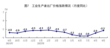 前三季度,全國(guó)工業(yè)生產(chǎn)者出廠價(jià)格同比下降2.8%。其中,9月份同比下降2.3%,降幅比上月收窄0.6個(gè)百分點(diǎn),環(huán)比持平。前三季度,工業(yè)生產(chǎn)者購(gòu)進(jìn)價(jià)格同比下降3.2%。其中,9月份同比下降3.1%,降幅比上月收窄0.9個(gè)百分點(diǎn),環(huán)比上漲0.1%。