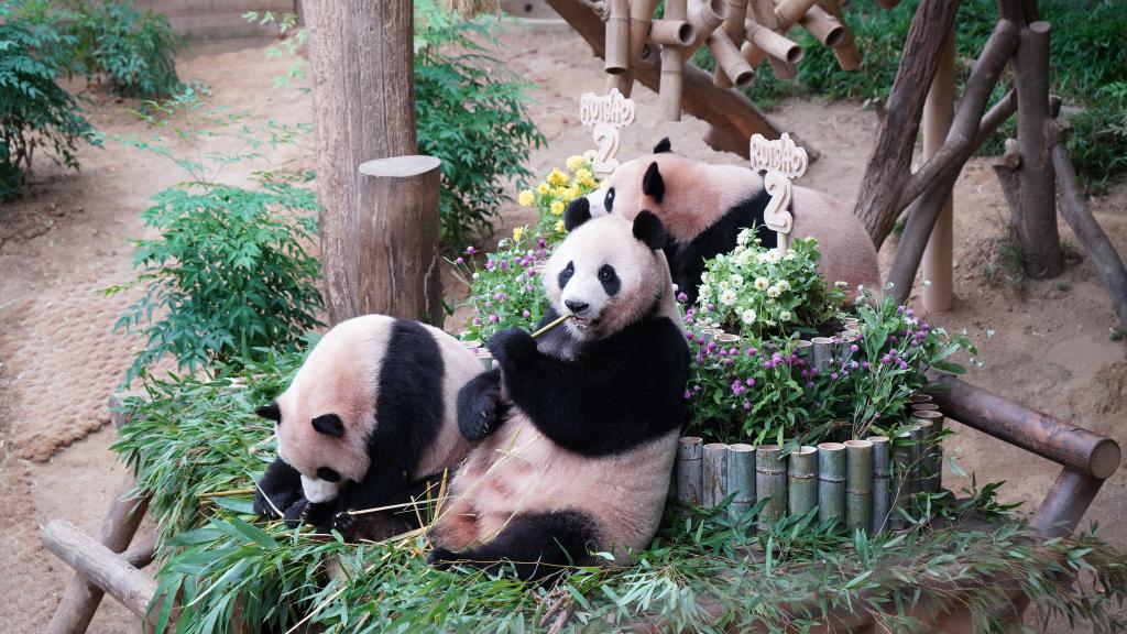 2025年7月7日,在韓國京畿道龍仁市愛寶樂園,大熊貓媽媽“愛寶”(中)和“睿寶”、“輝寶”在慶生活動上享用美食。新華社發(孫一然攝)