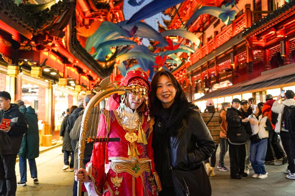 2024年11月30日,來自韓國的游客(右)在上海豫園商城與游戲角色裝扮者合影。新華社發(謝鑫攝)
